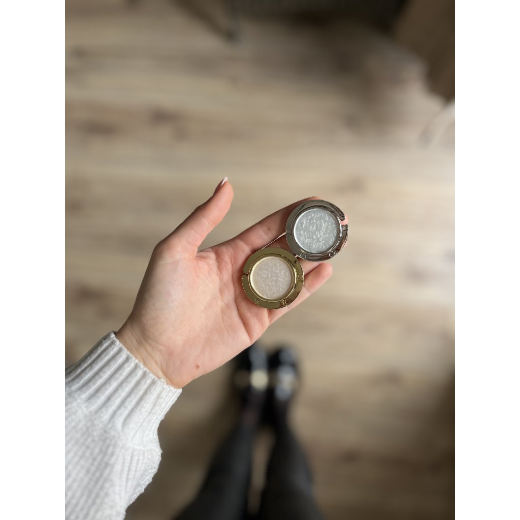 Mindig jól jön, ha van nálunk kéznél egy apró táskaakasztó, így nem kell táskánkat a földre, ölünkbe vagy magunk mögé a székre tenni 😉 Kompatibilis, kis helyen elfér, így mindenhova tudjuk magunkkal vinni. Kb. 4,5 cm, saját gyöngyházfehér díszítéssel, arany és ezüst színben kapható.